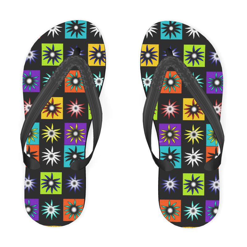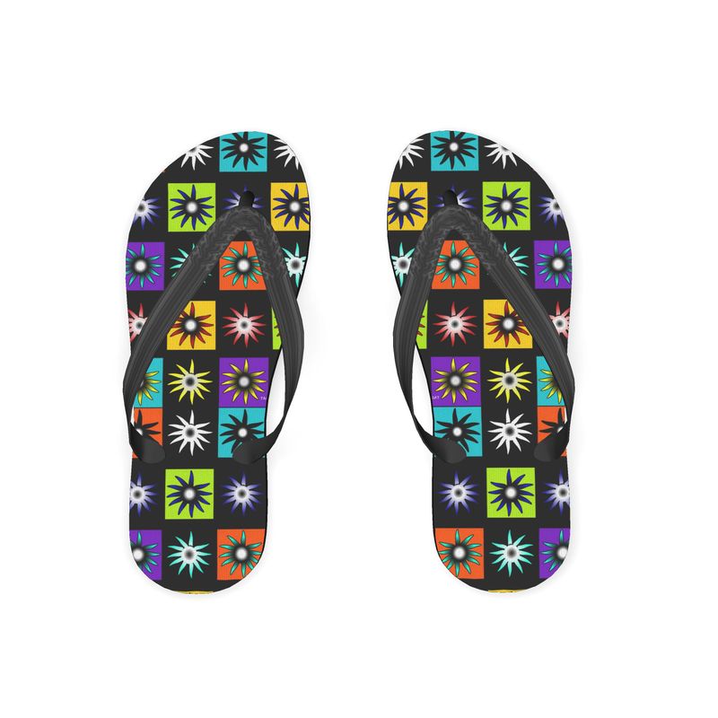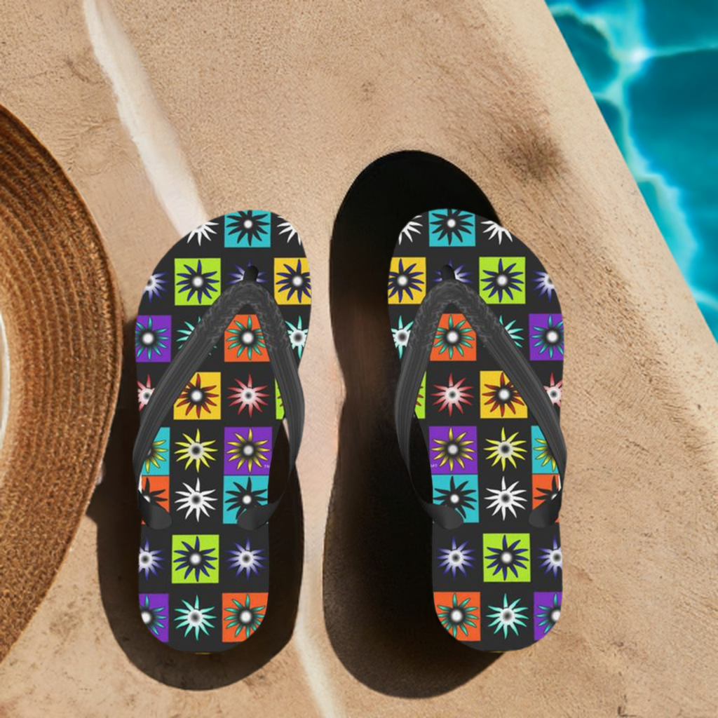 These Funky Flip Flops feature an abstract design with pops of vibrant color, making them a statement piece for any summer outfit. Stand out from the crowd with the unusual and eye-catching design. Perfect for those looking to add a unique touch to their wardrobe.