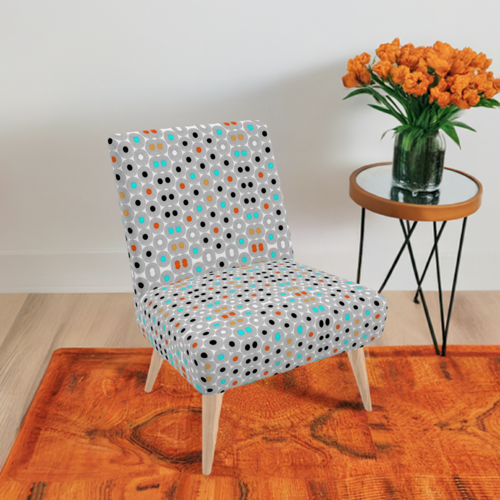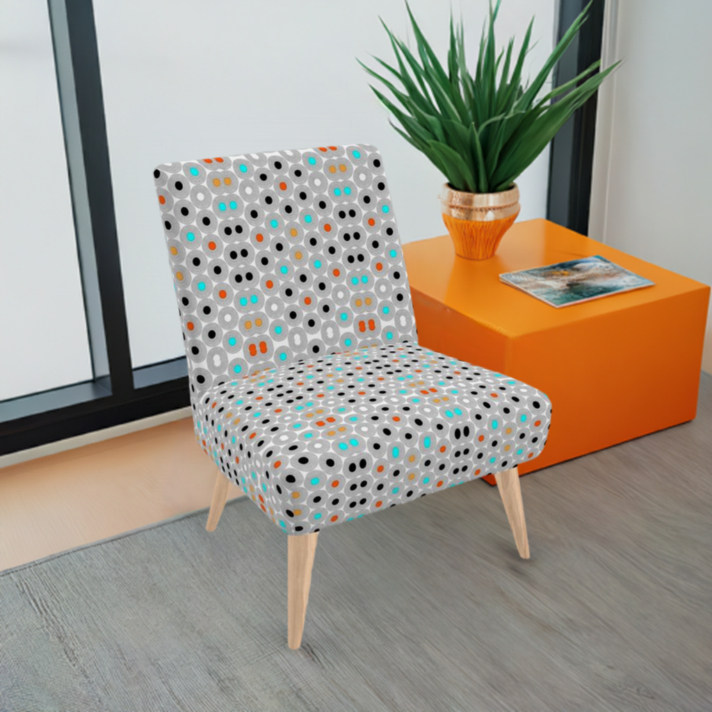 Elevate your space with our Occasional Chair! With an unusual and unique design, this chair is sure to stand out in any room. The bright orange, turquoise, black, and white circle pattern adds a pop of color and personality. Make a statement and add a touch of fun to your home decor.